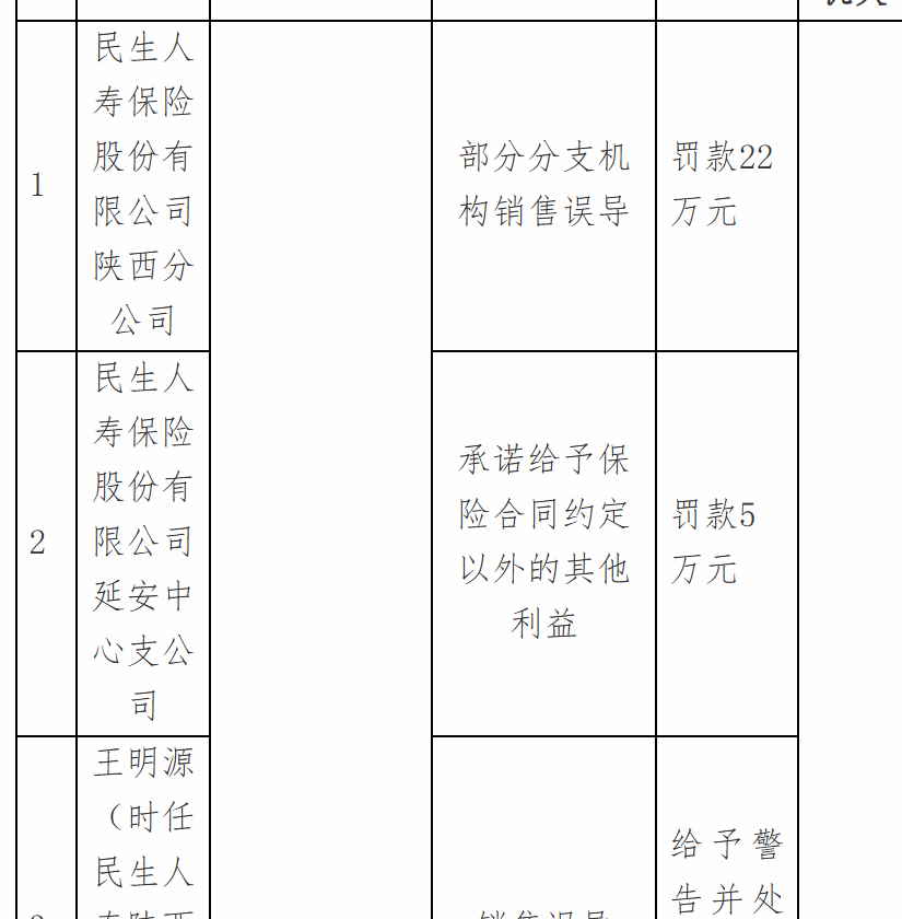 12月25日,国家金融监督管理总局陕西监管局行政处罚信息公示表显示,民生人寿保险股份有限公司陕西分公司因部分分支机构销售误导被罚款罚款22万元;民生人寿保险股份有限公司延安中心支公司因承诺给予保险合同约定以外的其他利益被罚款5万元;王某源因销售误导被警告并处3万元罚款;王某山因销售误导被警告并处2万元罚款;许某、杨某旬因销售误导被警告并处1万元罚款;曹某斌因销售误导、承诺给予保险合同约定以外的其他利益被警告并处2万元罚款。